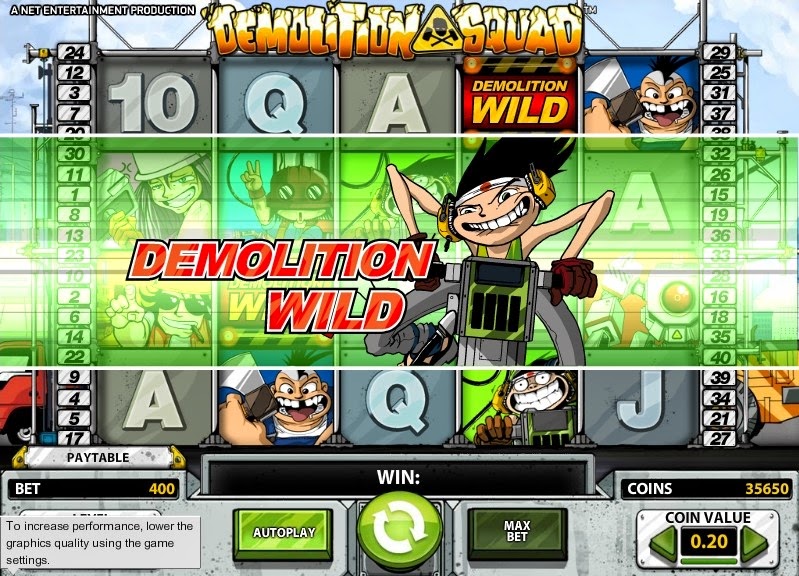 | Demolition Squad is brought to you by Net Entertainment and has a cartoon demolition theme with a Japanese style to it. It is a 5-reel and 40-payline video slot machine game with incredibly fun symbols like the welder, labourers, purple haired sledgehammer swinging lady, crane guy and robot sentry. Demolition Squad Slot is creative, entertaining and engaging and has all the basic qualities that a good online slots machine in today's technological era should have. The sound tracks are fast paced and well suited with the theme. In addition to individual members of the demolition team on the reels in machines games Demolition Squad you can find a Wild and Scatter symbols as well as symbols of poker cards 10, J, Q, K and Ace. To complement the winning line which is formed by using the right combination of symbols can be especially helpful Demolition Wild symbol. The top payout is 120,000 coins with a 4,000 coin jackpot that is triggered by getting 5 red robot symbols. Demolition Squad caters to all pockets as you can play from 40p a spin to a whopping €200 a spin. |