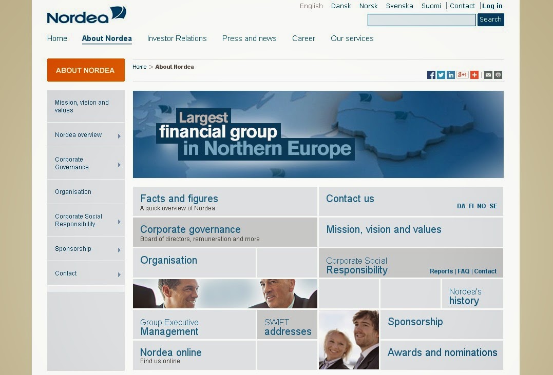 | About Nordea | Nordea Bank AB, commonly referred to as Nordea, is a Nordic-based financial services group operating in Northern Europe. The bank is the result of the successive mergers and acquisitions of the Finnish, Danish, Norwegian and Swedish banks of Merita Bank, Unibank, Kreditkassen (Christiania Bank) and Nordbanken that took place between 1997 and 2000. The Baltic countries and Poland are today also considered part of the home market. |